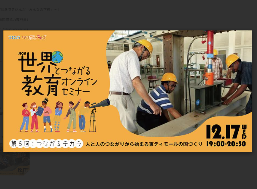 第5回では、東ティモール国立大学の教育再建に携わった風間秀彦氏が「つながるチカラ」をテーマに、独立直後の混乱の中で人材育成や教育体制を築いた経験から、人と人のつながりの重要性をお話しされます。