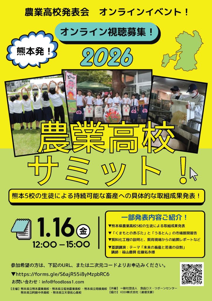 全国各地の農業高校においてエコフィード(環境配慮型飼料)の取組を支援する、食品ロス・リボーンセンターは、熊本県内5校と三重県の農業高校の生徒が集合し各校の取組を紹介するオンラインイベントを開催します。