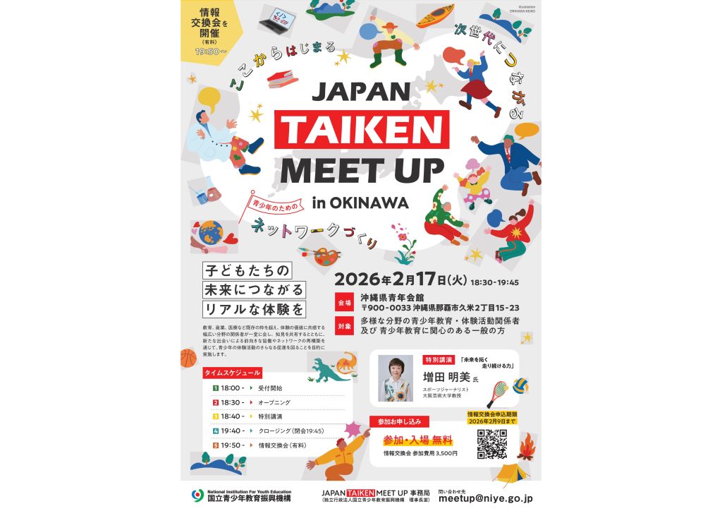 独立行政法人国立青少年教育振興機構は、沖縄県那覇市で教育、産業、医療など既存の枠を超え、体験の価値に共感する幅広い分野の関係者が一堂に会するミートアップイベントを開催します。
