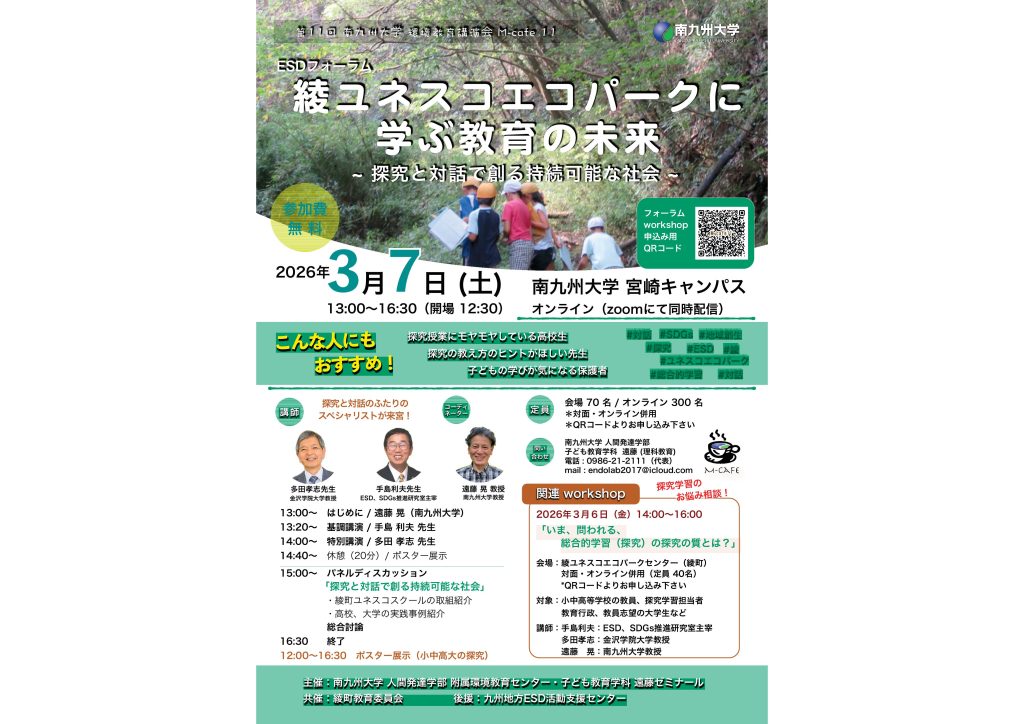 南九州大学 子ども教育学科 遠藤ゼミナールは、探究学習やユネスコスクールの取組をテーマにESDフォーラムを開催します。