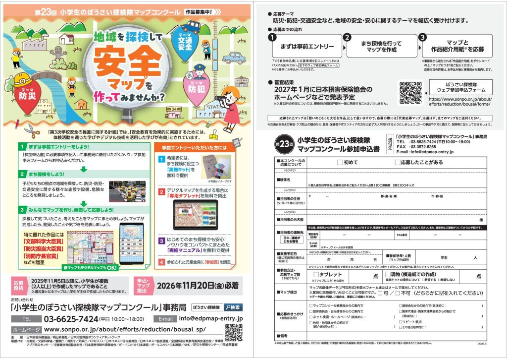 日本損害保険協会は、安全教育プログラムである「ぼうさい探検隊」活動を推進するため、小学生が作成した地域安全マップを全国から募集する「小学生のぼうさい探検隊マップコンクール」を開催します。