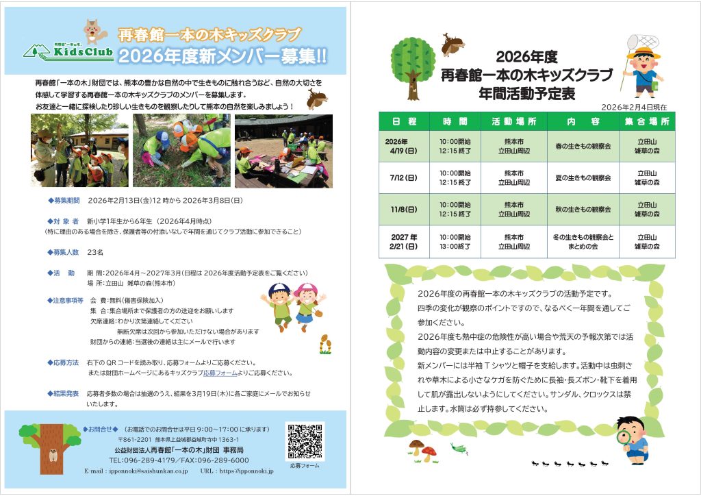 再春館「一本の木」財団では、熊本の豊かな自然の中で生きものに触れ合うなど、自然の大切さを体感して学習する再春館一本の木キッズクラブのメンバーを募集します。