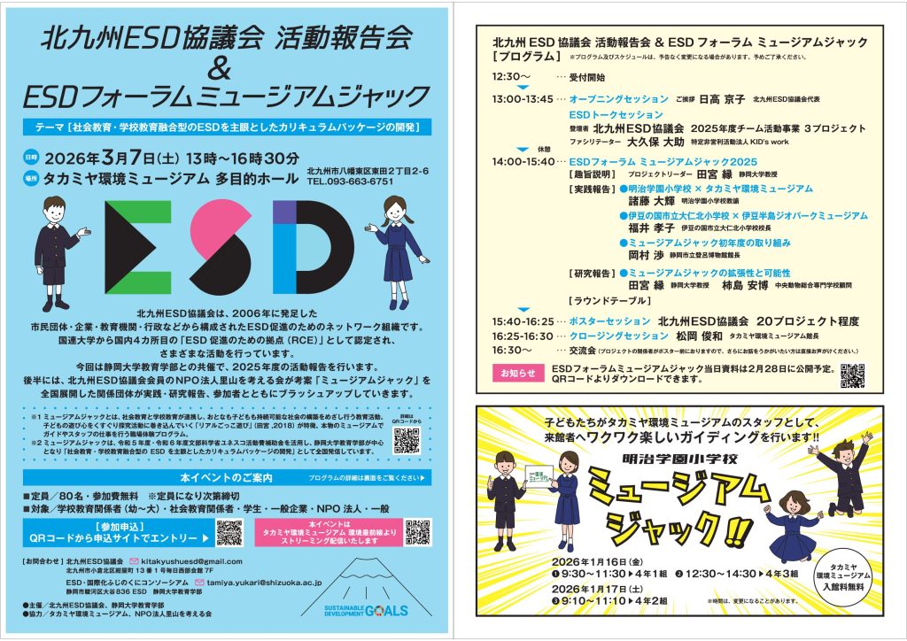 北九州ESD協議会は、2006年に発足した 市民団体・企業・教育機関・行政などから構成されたESD促進のためのネットワーク組織です。国連大学から国内4カ所目の「ESD 促進のための拠点 (RCE)」として認定され、さまざまな活動を行っています。今回は静岡大学教育学部との共催で、2025年度の活動報告を行います。後半には、北九州ESD協議会会員のNPO法人里山を考える会が考案 「ミュージアムジャック」を全国展開した関係団体が実践・研究報告、参加者とともにブラッシュアップしていきます。